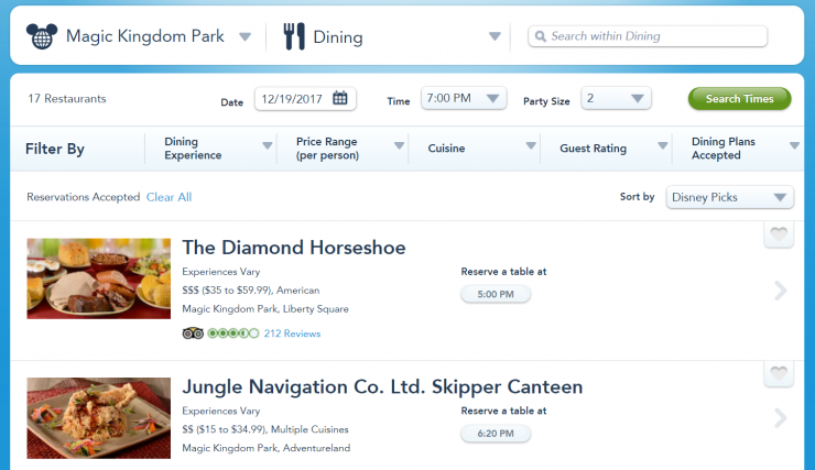 Veel restaurants zitten al ver van tevoren vol, dus het is verstandig om van tevoren een reservering te maken. Dit kun je doen via de website met je MyDisneyExperience account of via de app. Selecteer je datum en tijdstip en je ziet elke restaurants nog een plekje hebben. Om de reservering af te ronden vul je jouw creditcard gegevens in. Je kunt van tevoren het menu alvast bekijken. Soms is het lunchmenu voordeliger dan het dinermenu, hou hier dus rekening mee als je gaat boeken.