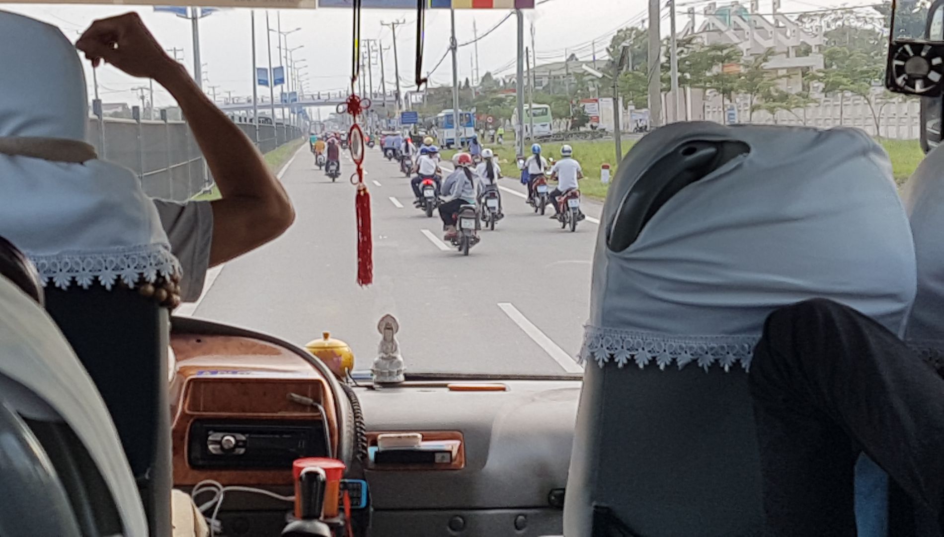 We vertrekken vanuit Saigon en we worden opgehaald voor ons hotel New Saigon Hotel. De eerste stop is My Tho, zo’n 2,5 uur rijden vanaf ons startpunt. Een zeer hobbelige weg, maar de bus heeft goede vering en ze rijden rustig. Er wordt beloofd dat het op de snelweg beter wordt. Als we na een tijdje vragen waar die snelweg is, dan is het antwoord dat we al een uur op de snelweg rijden. Dus…