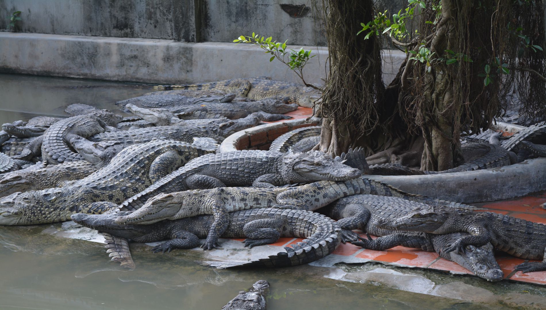 Eenmaal terug varen we terug naar My Tho waar we in de bus stappen richting Chau Doc. We zijn nu met veel minder dan in de vorige bussen en het is ook een klein busje geworden. Het nadeel van deze busjes is dat deze veel sneller gaan en dat weet de chauffeur ook… Helaas. We hebben ook een andere gids, die veel minder Engels spreekt dan de vorige. Via een ferry komen we aan bij een krokodillen boerderij. Helaas worden deze krokodillen gebruikt voor tasjes en andere kleding. We zijn ook snel uitgekeken. De andere mensen in ons busje zijn Vietnamees en die krijgen veel meer informatie van de gids dan wij, omdat wij geen Vietnamees spreken. We nemen maar een ijskoffie en wachten tot we weer verder gaan.