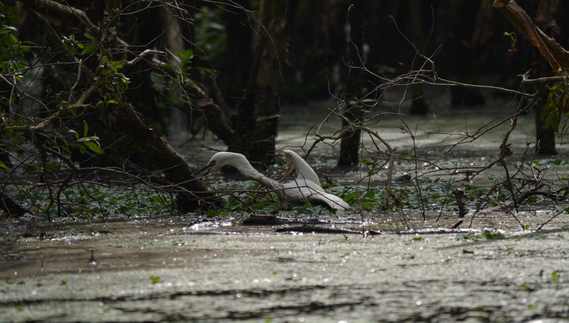 Eenmaal terug bij de bus is de chauffeur druk bezig met het schrobben van de bus en het lukt hem aardig. Er is niets meer te zien van de witte verf. We zetten koers naar Tra Su Bird Santuary om met stille bootjes naar vogels te kijken. De bootjes zijn alleen niet zo stil en we scheuren over het water. Ergens worden we er uit gezet en worden we in kleinere, stille bootjes gezet. Overal hoor je vogels, maar je ziet ze bijna niet. We zien 1 witte vogel die vast zit, maar we kunnen helaas niets doen. Het is wel erg leuk om door de mangrove te varen met deze stilte.