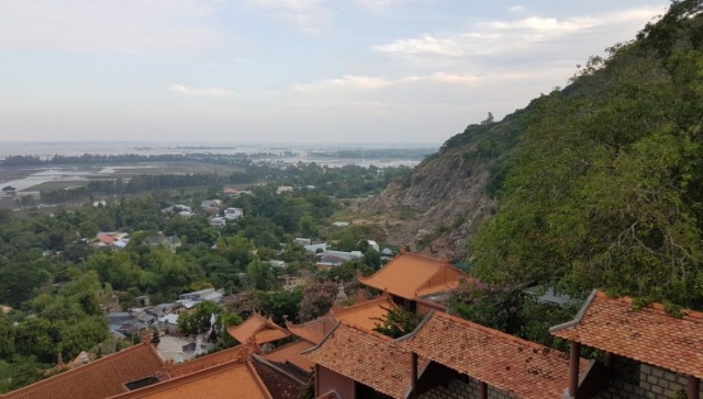 De laatste dag in deze bijzondere omgeving. We beginnen nog vroeger en bij het ontbijt zien we de lokalen van de delta ook wakker worden. De buschauffeur komt er achter dat zijn bus helemaal beklad is met verf. Erg sneu. Toch vertrekken we en we stoppen bij een pagode in een berg die lijkt op een papegaai. Het is een flink stuk omhoog, maar dat mag de pret niet deren. Eenmaal boven ziet het er schitterend uit. Allemaal beelden en de tempel is goed te zien. Eenmaal binnen krijgt de andere heer van ons gezelschap een doek van de monniken om zijn benen te bedekken. Ik krijg die echter niet, bijzonder. We lopen door grotten met beelden van allerlei goden (geen idee welken, want de gids spreekt nog altijd geen Engels) naar de tempel. Het uitzicht is enorm mooi en de tempel ook.