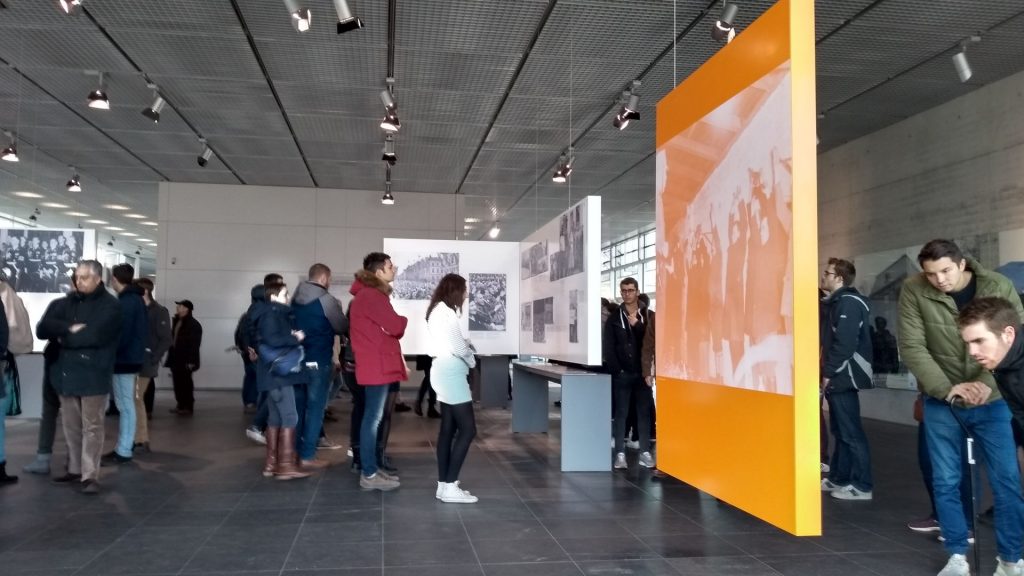Als we aan het einde weer een stukje omhoog komen zien we het nieuwe gebouw staan. Dit is het Topographie des Terrors en is in 2010 opengesteld. Het is een expositie van de misdaden van de Nazi’s tijdens de tweede wereld oorlog. Van begin tot einde. Het expositie is eigenlijk in een grote ruimte. Als je aan de goede kant begint kun je lezen en zien aan de hand van foto’s hoe het moet zijn geweest. Tevens staan hier en daar computers waar je fragmenten kunt terugkijken tussen 1933 en 1945. Hier kun je onder andere toespraken van Adolf Hitler bekijken, maar ook van Himmler. Helaas zijn deze nagesynchroniseerd, dus de “charme” is er een beetje vanaf.