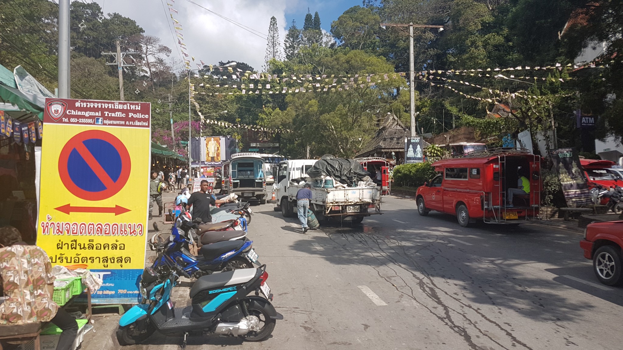 Chiang Mai is geen kleine stad en de vele tempels liggen ver uit elkaar. Daarom besluiten we om via Dozy House een scooter te huren. En het is een Honda Click en daar zijn we fan van geworden. We verzamelen onze spullen (camera, petjes, rijbewijzen met bijbehorende internationale rijbewijzen, geld, water en brillen) en gaan op pad. Onze eerste stop is Wat Phrathat Doi Suthep. Een tempel buiten Chiang Mai en ook onze enige stop buiten de stad.