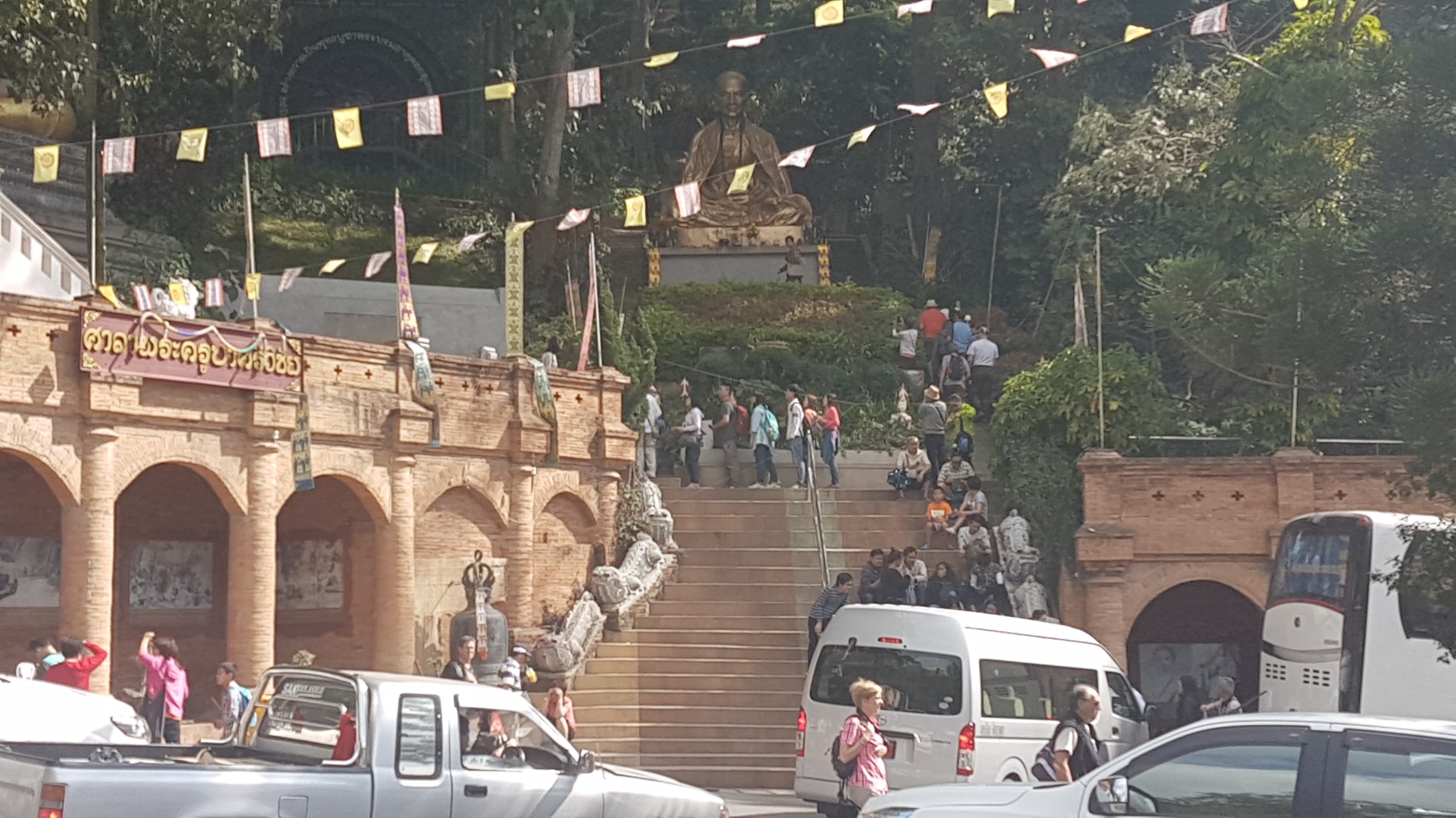 De rit er naar toe geeft ons heimwee naar de Mae Hong Soon loop. We gaan lekker omhoog en het is niet al te druk. Een paar scherpe bochten en hellingen waar deze Honda wel moeite mee heeft. Onderweg komen we fietsers, wandelaars en taxi’s tegen. Allemaal omhoog. Onderweg stoppen we bij een uitzichtpunt waar we een mooi zicht hebben over de stad Chiang Mai, wat is het eigenlijk groot.