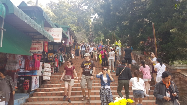 Als we weer op de scooter klimmen zegt een jonge Thai, vol enthousiasme en een grote glimlach “Go go go, go fast!!!”… Dit ding gaat niet harder! Maar dat mag de pret niet deren. We klimmen door en uiteindelijk komen we bij een straat uit vol met winkeltjes. Ik rijd wat langzamer en we zien dat het voornamelijk toeristen-troep is. En toeristen zijn er ook genoeg.