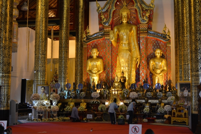 Weer terug in Chiang Mai gaan we naar de volgende tempel, Wat Chedi Luang. Dit is de grootste en veelzijdige tempel die we vandaag zullen aan doen. Er is een entreeprijs, maar aanzienlijk lager dan bij Wat Phrathat Doi Suthep. Als we binnenkomen zien we al verschillende gebouwen staan. De eerste is alleen toegankelijk voor mannen. Ik loop, met schoenen uit natuurlijk, naar binnen. Voor een tempel waarin alleen mannen mogen komen zijn er toch aardig veel afbeeldingen van vrouwen op de muren.