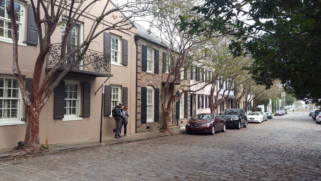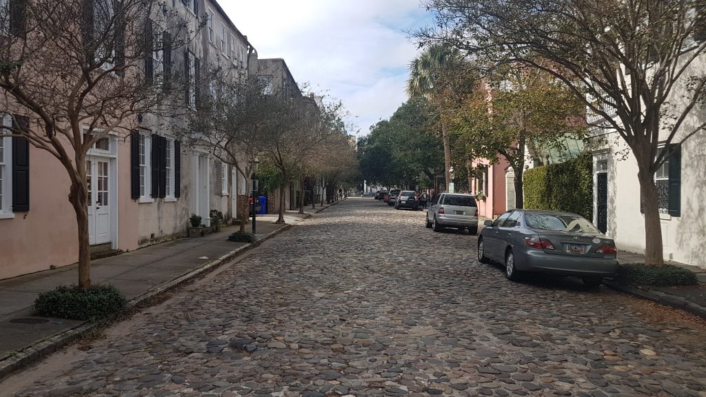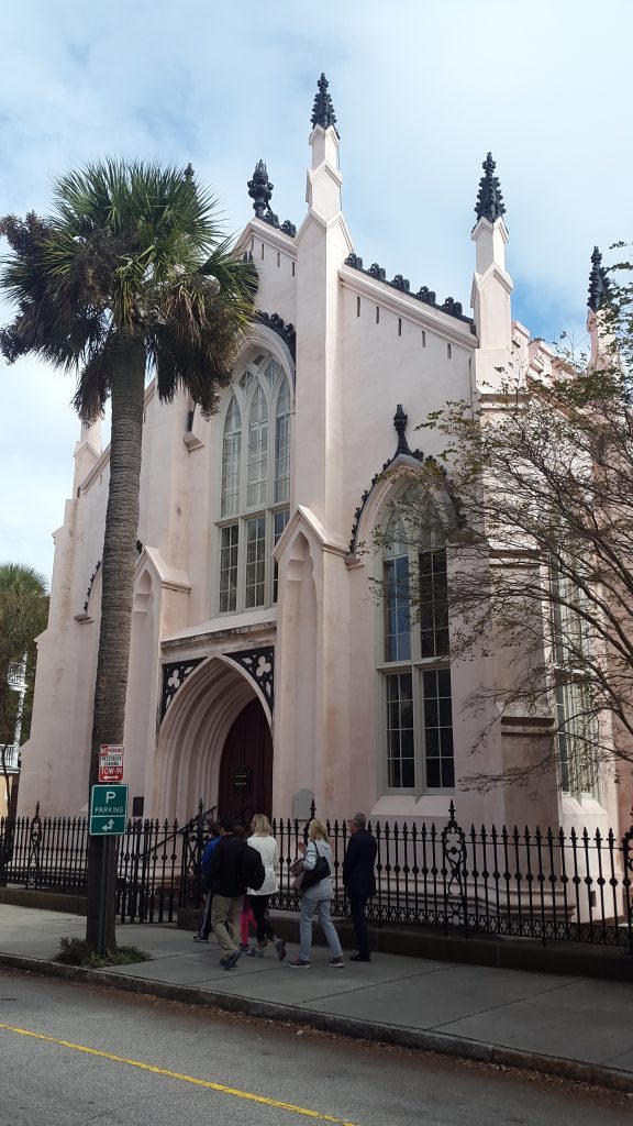 Aan de overkant van de straat zien we de kerk liggen, een groot gebouw met een zacht roze kleur. Deze kerk wordt nog altijd gebruikt voor diensten en helaas kunnen we dan ook niet naar binnen. De kerk is net afgelopen en mensen staan gezellig nog even na te kletsen. Leuk al die hoedjes, het past helemaal bij de oude stijl van deze straat. Ook verderop zien we een kerktoren, deze behoort bij St. Philip’s Church. Dit is één van de oudste kerkgemeenschappen in de Verenigde Staten. Het gebouw is van de buitenkant al prachtig en dus was deze wandeling niet voor niks.