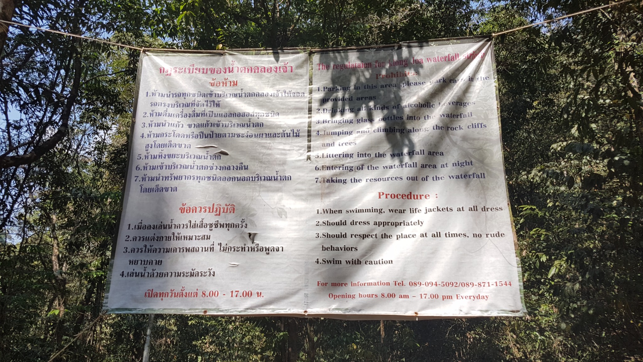 Aangezien we nog steeds niet toe zijn aan het strand nemen we de gok om op zoek te gaan naar de waterval. Het ritje er naar toe is in ieder geval al erg leuk, lekker beschut onder de bomen. En dan kunnen we gelijk even langs de Tourist Information om de boot terug naar Trat te regelen. Dus stappen we weer op ons stalen ros en gaan we die kant op. De vorige keer dat we naar de Tourist Information wilde was deze gesloten. Maar nu zien we scootertjes staan, dus we stoppen en gaan op zoek naar informatie. Er zit een mevrouw achter een bureau die nou niet bepaald uitnodigend vraagt wat we willen. Ze geeft met een chagrijnig hoofd de tijd van de boot, de kosten en zegt nog net dat de taxi inbegrepen is. We kopen twee tickets en hopen maar dat ze wel gewoon haar werk doet en er daadwerkelijk voor zorgt dat er op onze laatste dag een taxi staat. Als we nog even wat andere informatie doorbladeren komt er nog een man tegen. Ook hij wordt niet zo heel vriendelijk te woord gestaan en gaat zonder resultaat weer weg.