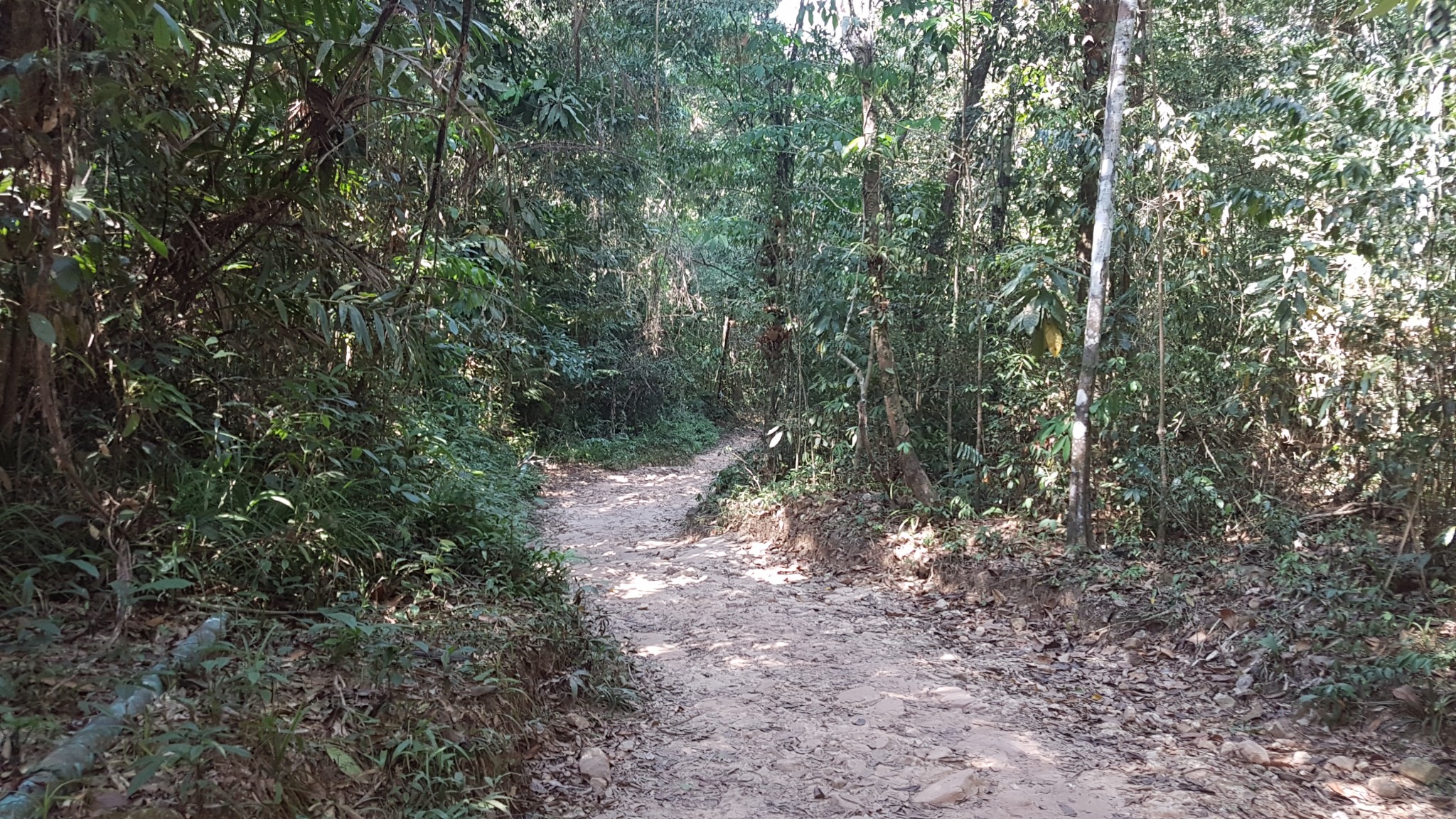 We rijden verder richting de waterval. Het laatste stuk van de weg is onverhard en vol met kleine en grote stenen. We stuiteren naar de parkeerplek en zijn blij als we verder kunnen lopen. Er zit een man met een donatiepot, maar we gaan eerst maar eens kijken of het de moeite waard is. We zien al heel snel vooral heel veel stenen, dus dat wordt klauteren en klimmen. Ergens in de verte zien we iets wat in het regenseizoen de naam waterval verdiend maar nu gewoon een klein stroompje water is. Onder de waterval is een soort van meer waar je in mag zwemmen. We zoeken onze weg die kant op en vragen ons af hoe het hier is in het regenseizoen, dan moet het best indrukwekkend zijn. Het zwemmen laten we aan de overige bezoekers over, aangezien we er niet op gekleed zijn. Kenji is weer helemaal in zijn element en klimt alle kanten op. Ik hou het maar even bij het toekijken en genieten van het mooie weer. Op de terugweg laten we een kleine donatie achter voordat we terug gaan naar ons resort.