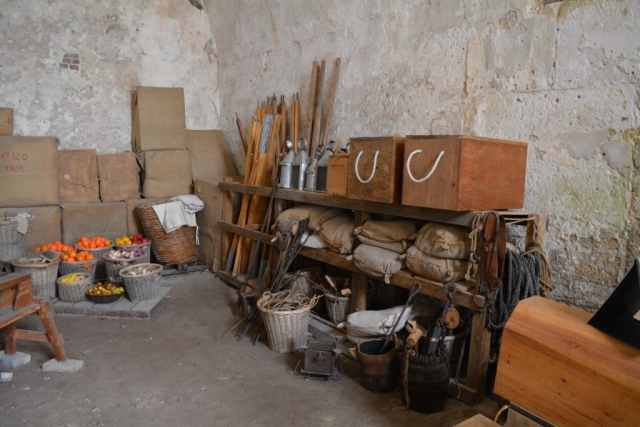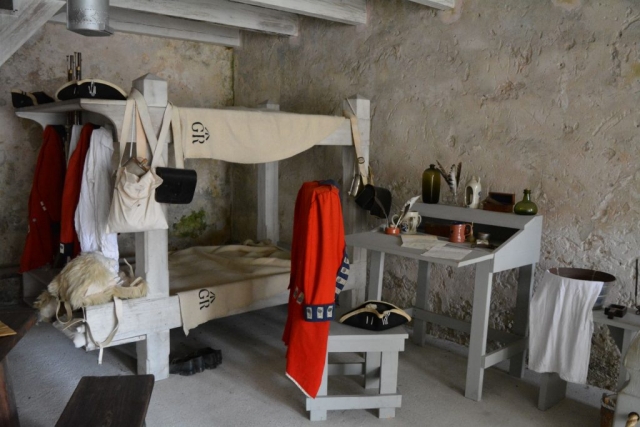 We lopen via de enorme entree naar de binnenplaats. Het eerste wat me opvalt is dat het eigenlijk helemaal niet zo groot is. Rondom de binnenplaats zijn allerlei ruimtes in de muur gemaakt. Elke ruimte heeft (en had) een eigen functie. Zo had je er de munitieopslag, barakken, keuken, badkamer (laten we het zo maar noemen), kapel, gevangenis en nog meer. We krijgen een summier kaartje met een plattegrond en wat informatie. We lopen met de klok mee naar de verschillende ruimtes.