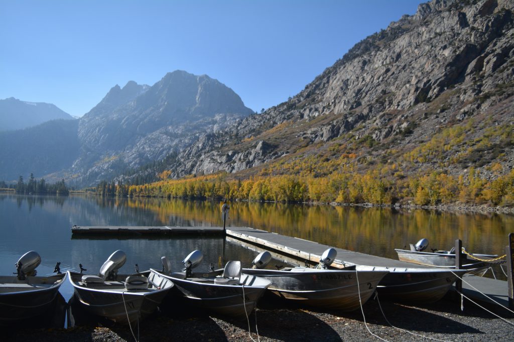 De June Lake Loop loopt langs een aantal kleine plukjes met huizen, motels en winkeltjes. Het gebied is omringd door verschillende meren en vanaf de weg heb je een mooi uitzicht. Er zijn heel veel plaatsen waar je de auto even neer kunt zetten om foto’s te maken en te genieten van het uitzicht. Hoe verder je komt op de route hoe meer je de herfstkleuren ziet. We stoppen bij Silver Lake en lopen een stuk langs het meer. Er zit hier ook een winkel/restaurant waar je onder andere visaas kunt kopen. En daar wordt gretig gebruik van gemaakt. Aan het meer liggen een aantal boten die je kunt huren, maar daar is het nu te fris voor. Ook hier zien we weer een waarschuwing voor beren. Het is heerlijk om hier even rond te lopen, ondanks de kou. Het voelt als een lekkere Nederlandse winterdag die je afsluit met een flinke mok warme chocolademelk (mét slagroom natuurlijk).