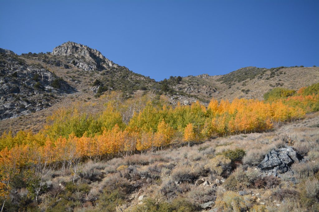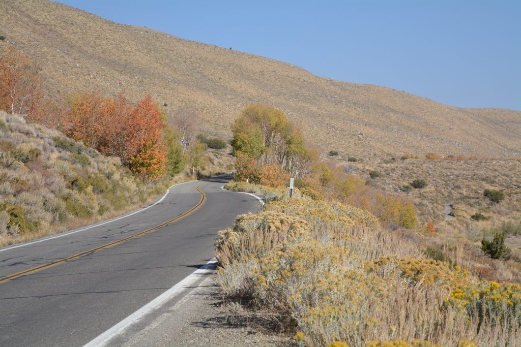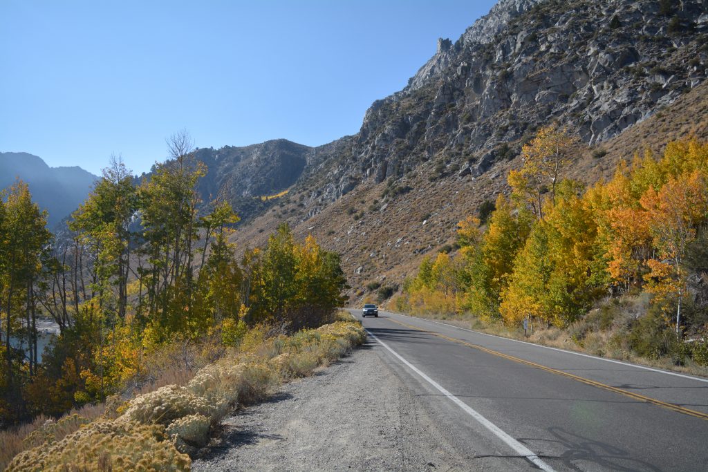 We zijn nu halverwege oktober en de herfst heeft in dit gebied zijn intrede gedaan. Volgens de man van het motel zijn we precies op het juiste moment om de échte herfstkleuren te zien. Hij geeft ons een folder met een aantal gebieden waar je het beste heen kunt gaan. Toevallig ligt één ervan op onze route naar Yosemite National Park. Het is de June Lake Loop, een mooie weg die rondom het naastgelegen plaatsje June Lake ligt. De route is slechts 25 kilometer en je begint en eindigt op de doorlopende weg US Route 395. In de winter is deze route niet (geheel) toegankelijk.