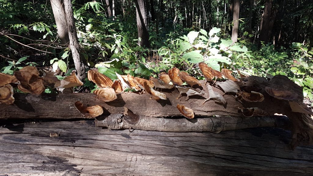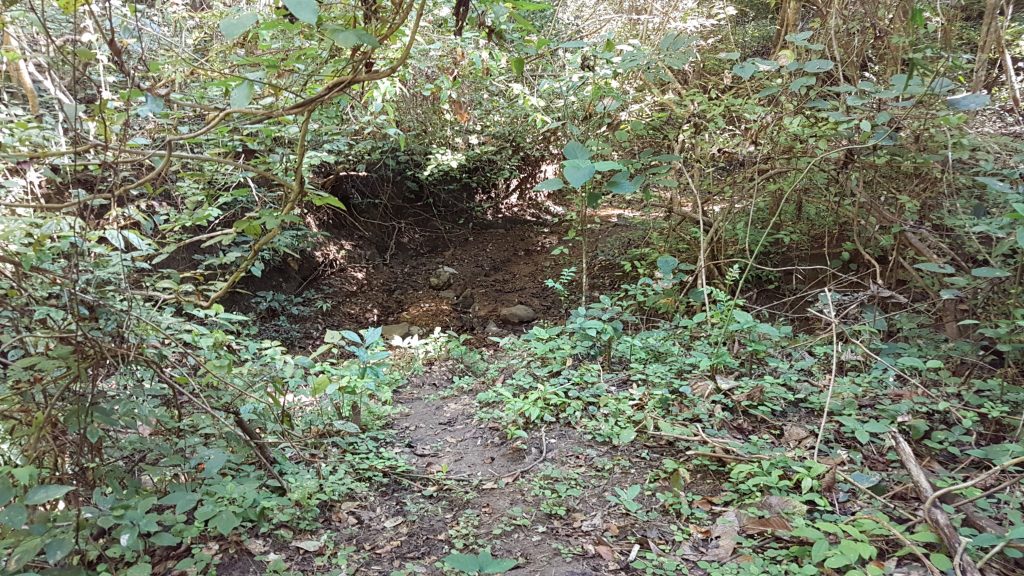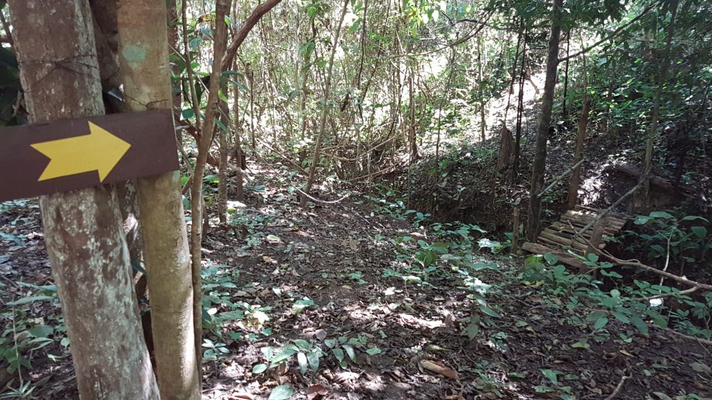 We zoeken onze weg tussen al het groen en de bladeren door. Zo af en toe staat er een hekje of een ander bouwwerk waaruit blijkt dat we op de goede weg zijn. Als we een stuk gelopen hebben vinden we ook borden met informatie erop. De eerste is iets te veel uitgewassen door de regen, maar de titel klopt met het bord wat we beneden hebben gezien. Dit is echt een nature trail, eentje die vraagt om scherpe ogen en een beetje inschattingsgevoel. Heel af en toe als je het echt niet meer weet zijn er dan de pijlen om je verder te helpen. Het is hier wel heel stil op een vallende tak of vallende boom na. Ook de vogels genieten van dit paradijs waar zo te zien niet heel veel mensen komen.