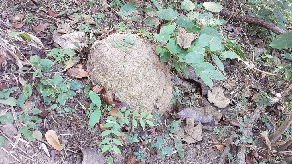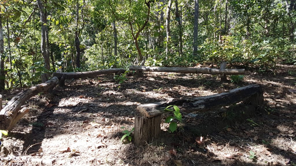De tocht begint met een trap naar boven. We klimmen hoger en hoger en hoger. Er staat verder niet echt veel aangegeven, zou dit wel goed zijn? Dan zien we een houten bordje met een gele pijl. Die zal er niet zomaar hangen. Dus die gaan we maar volgen. Hier en daar treffen we een houten bord aan wat er uit ziet als een informatiebord. Er staat alleen helemaal geen informatie op. Dat was tijdens de vorige wandeling in het bos ook al. Zou dat een Thaise meditatie oefening zijn?