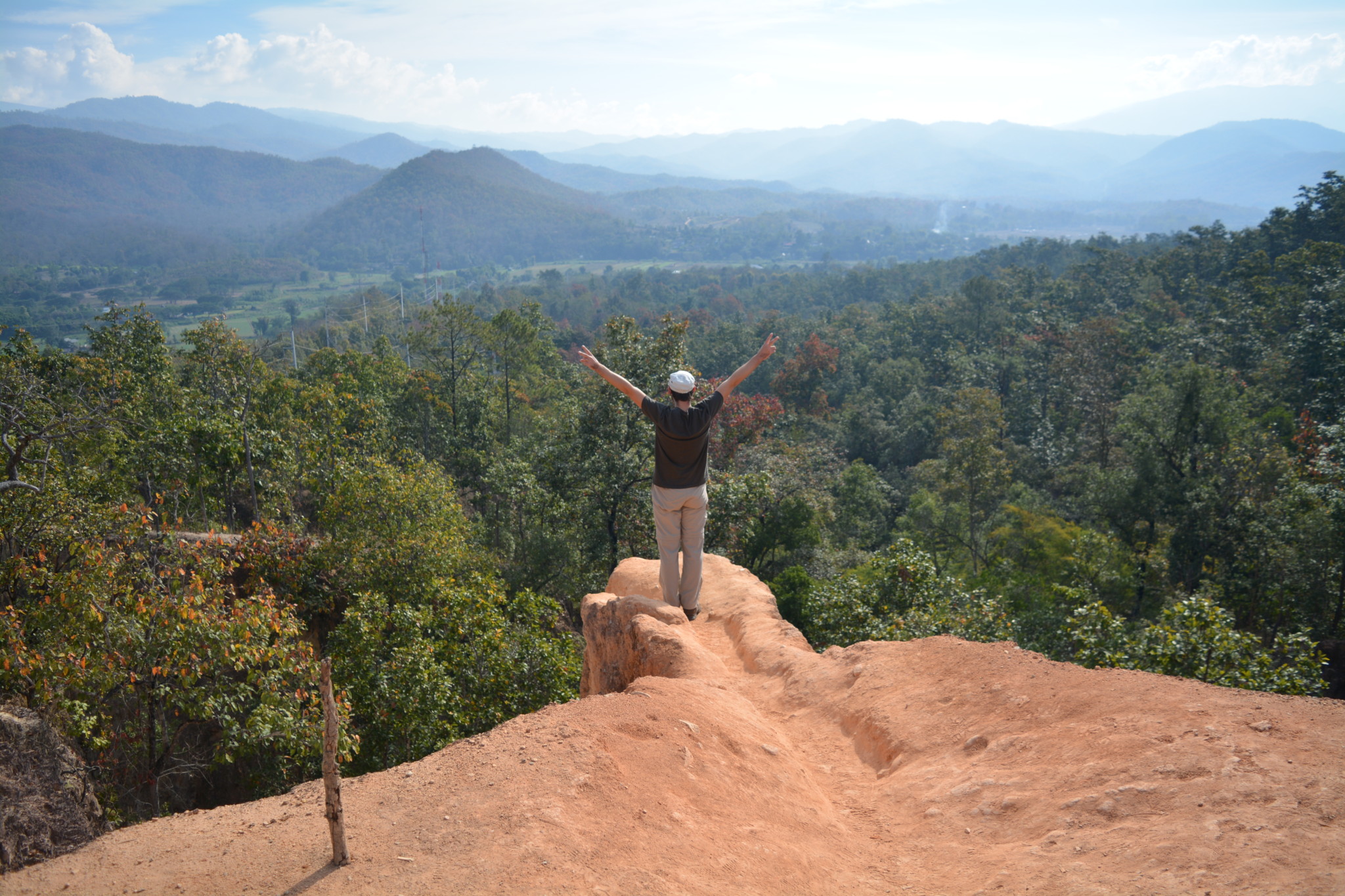 Gekscherend wordt Pai Canyon wel eens de Grand Canyon van Thailand genoemd, wat misschien een beetje overdreven is, maar mooi is het wel! We hebben gelezen dat veel mensen hier komen om de zonsondergang te zien, dus gaan wij er lekker vroeg op de ochtend naar toe. Als we aankomen zien we al wel wat tourbusjes staan, maar alle omliggende winkeltjes en eettentjes zijn nog gesloten. Via een trap lopen we naar boven. Nog even een discussie aan welke kant van de trap je nou omhoog moet lopen, omdat (net als de weg) roltrappen vaak precies omgedraaid zijn ten opzichte van Nederland. Maar uiteindelijk maakt het niet uit, we komen op weg naar boven bijna niemand tegen.