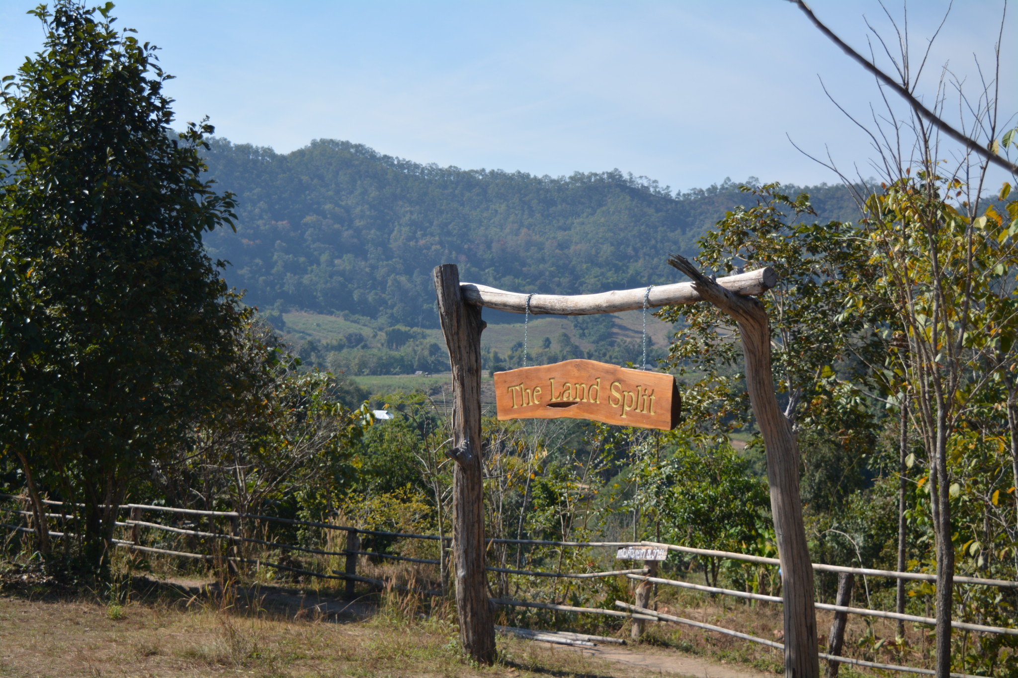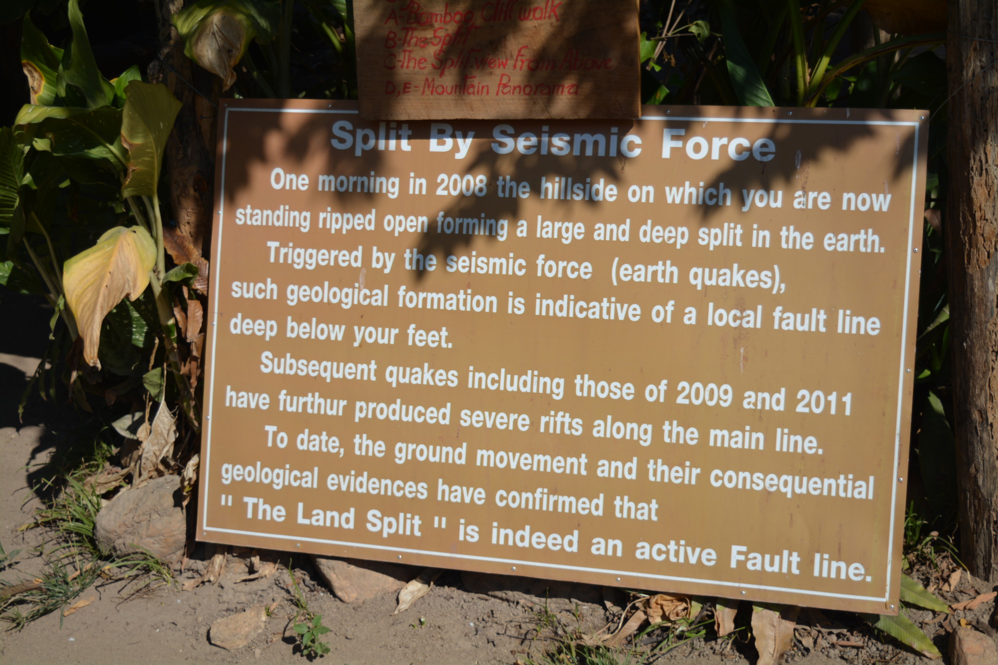 Onze volgende stop is The Land Split. Via een leuk landweggetje rijden we door een superklein en schattig dorpje. Het meer wat zich in de buurt van The Land Split bevindt is omgedoopt tot zwembad en voor een klein bedrag mag je (op eigen risico natuurlijk) een duik nemen. De Thaise bevolking is inventief en ziet overal mogelijkheden in om een beetje geld te verdienen. Dat geldt overigens ook voor The Land Split. Voorheen was dit een gewone boerderij met een flink stuk grond. Maar in 2008 is de grond na een aardbeving opengespleten. De grond was nu volkomen onbruikbaar geworden. De boer zag er echter mogelijkheden in en stelde zijn land beschikbaar als bezienswaardigheid. In 2009 en 2011 volgde nog twee aardbevingen die de grond nog verder verscheurden. Het verschijnsel zelf is nog niet eens zo heel bijzonder, het is meer de hele beleving eromheen die de boer gecreëerd heeft. Maar daarover later meer.