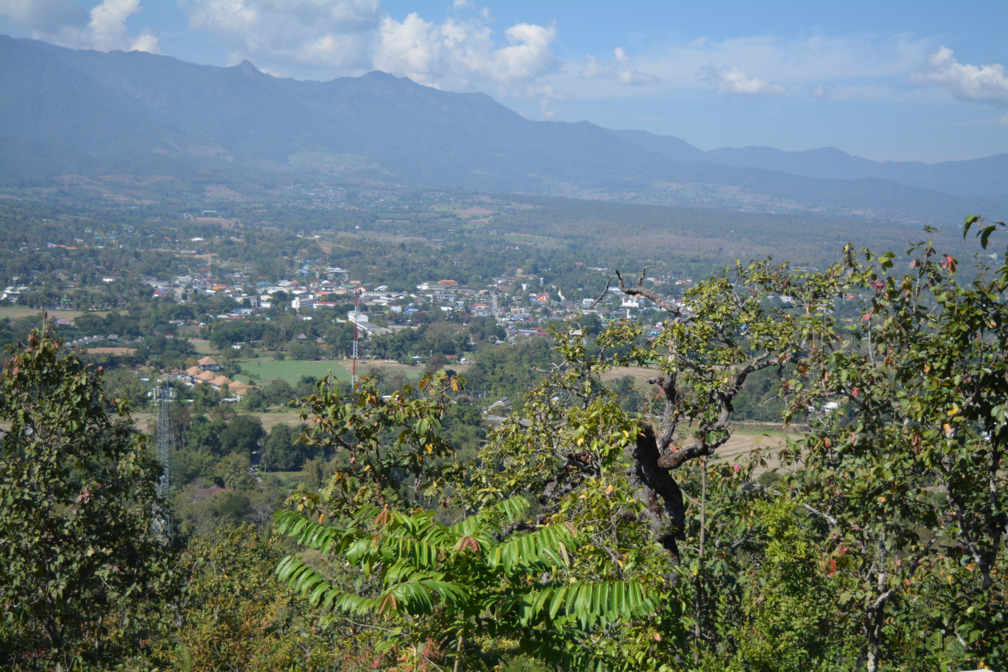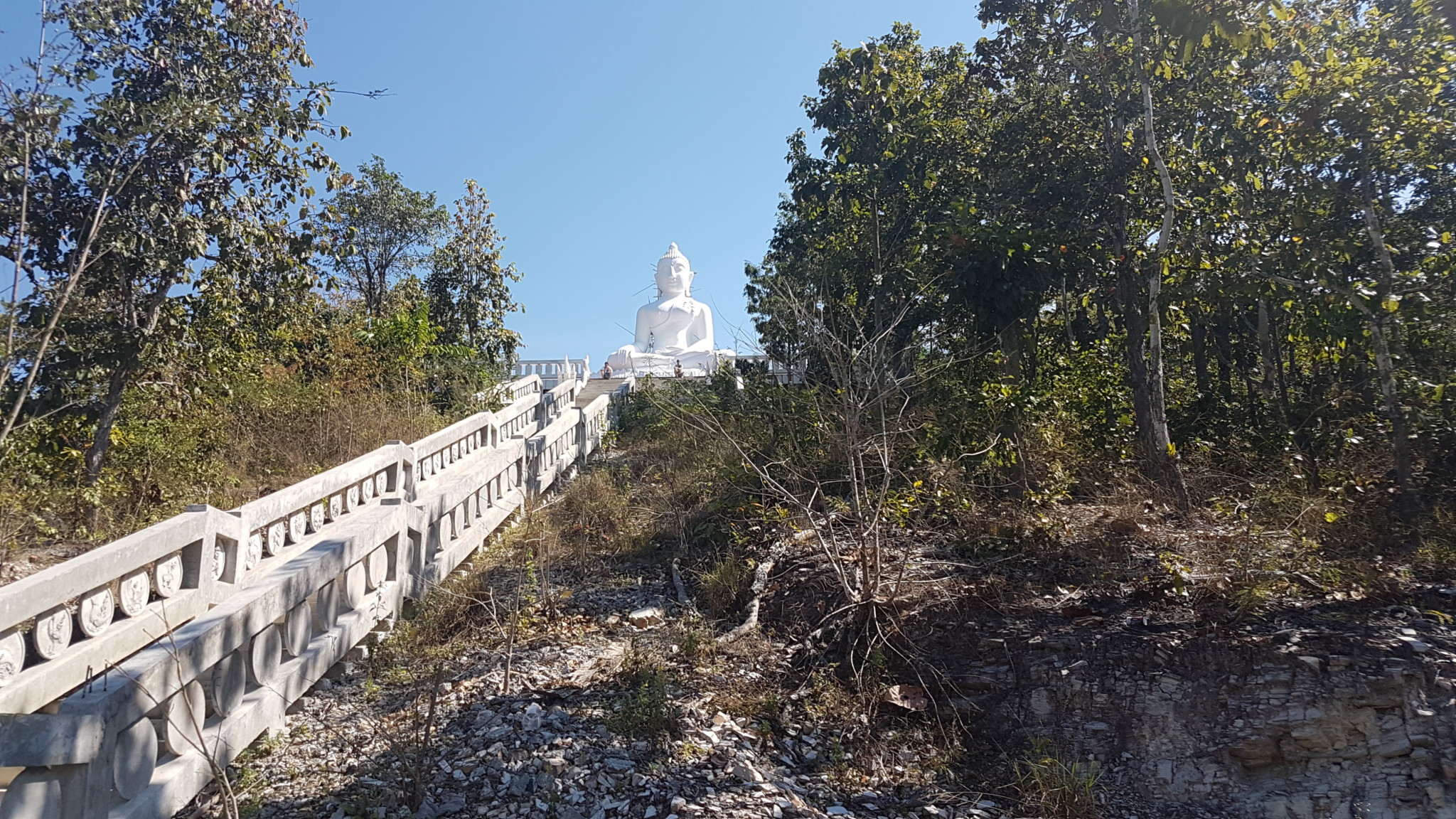 De witte Boeddha staat op de berg bij de tempel Wat Phra That Mae Yen. Als we daar aankomen zien we de onvermijdelijke trappen die altijd vooraf gaan aan mooie uitzichten. We parkeren Maximus tussen de tientallen scootertjes die er al staan en maken ons op voor de klim. Hoe hoger je komt, hoe mooier het uitzicht over Pai en hoe indrukwekkender de Boeddha. Helemaal bovenaan doen we onze schoenen uit om de Boeddha van dichterbij te bekijken. Het Boeddhabeeld wordt ondersteunt door een houten constructie in de rug, zelfs Boeddha heeft het dus wel eens moeilijk. Maar verder is het een prachtig beeld wat echt supergroot is. Vanaf dit hoogste punt heb je ook een heel mooi uitzicht over Pai. Het is de klim naar boven dus zeker waard. We gaan even op de trap zitten om te genieten.