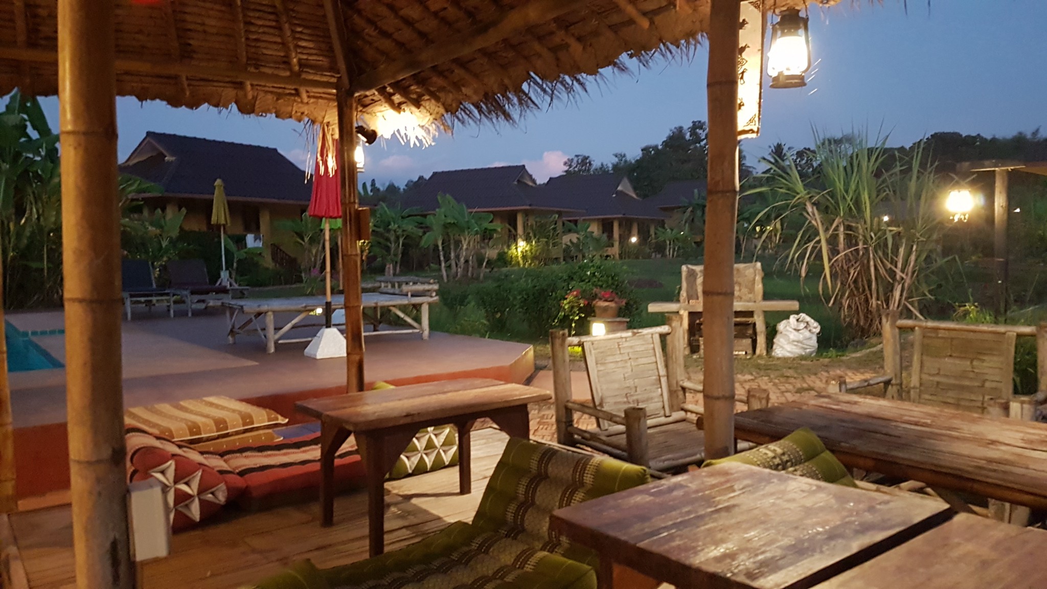De kamer is heerlijk ruim, zelfs de badkamer is erg groot. Het bed ligt heerlijk en we gaan even bijkomen van de dag. Even later is het buiten wat afgekoeld en kunnen we buiten gaan zitten. We besluiten een biertje te doen in de bar, waar de eigenaar (Pete) staat samen met een vriend van hem (Paul). We raken aan de praat en we krijgen wat tips over eilanden in Thailand die we kunnen bezoeken. Ook hebben we het over de beesten die hier zitten. Onderweg hadden we een slang gezien, maar die schijnen hier vaker voor te komen dan we dachten. Ook zitten er hier scorpioenen, enorme spinnen, vis en kikkers in de rijstvelden en heel veel gekko’s. Op de laatste vraagt Pete “Have you meet George?”, uhm… nee? Hij wenkt mij en schijnt met een zaklantaarn achter de koelkast. Daar zie ik een enorme grote, blauwe hagedis (de echte naam kan ik helaas niet vinden). Ook Rieneke gaat even kijken. Al die aandacht vindt George maar niets en hij trekt zich terug. Ook voor ons wordt het tijd om te gaan eten.