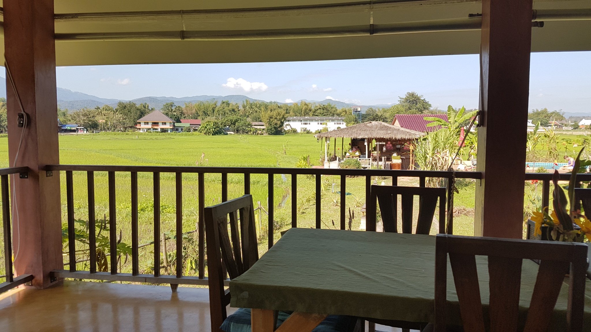 Volgens de kaart was het 4 uur van Pai naar Mae Rim, maar we schieten lekker op. We verlaten de doorgaande weg naar Chiang Mai en komen op binnen weggetjes terecht die ons uiteindelijk bij Mae Rim brengen. Dit is veel beter: Lekker rustig, lachende en vriendelijke mensen en geen scheurmonsters. Een half uurtje later komen we bij het Country Retreat aan. We zetten Maximus op stal en een Britse man verwelkomt ons. We zijn veel te vroeg, want het is geen 4 uur rijden. We hebben er uiteindelijk 2 uur over gedaan. Dus tijd voor een icecoffee en de hartslag weer verder omlaag brengen. Daarna even heerijk Thais lunchen. En dan is onze kamer klaar.