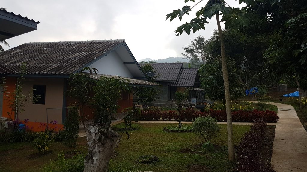 Op de kaart zien we dat het nog maar 15 minuten is naar ons resort. We zijn wel toe aan wat rust. Het is goed opletten, maar we vinden het. Er is een meisje aanwezig wat slecht Engels spreekt en ze belt iemand. De man aan de telefoon spreekt redelijk goed Engels en zegt dat hij ons in een andere bungalow wil plaatsen. Ja, prima… toch? We regelen alles, betalen en bekijken de kamer. Rieneke gaat eens in de boeking kijken en het blijkt dat we een upgrade hebben gekregen. Van een houten huisje naar een mooi stenen huisje met een prachtig balkon. Ook een mooi uitzicht over de tuin.