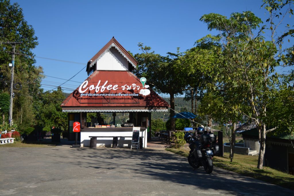 We parkeren naast het politiebureau en zien een leeg koffie zaakje. De vrouw spreek best goed Engels en verteld wat er op het menu staat. We bestellen koffie en gaan zitten. Het lijkt wel alsof er een zooitje lokalen zijn gebeld, want als we gaan zitten stroomt het ineens vol met Thaise mensen. Gelukkig zijn het geen Chinezen en worden we gewoon met rust gelaten of worden er geen foto’s van ons genomen.
