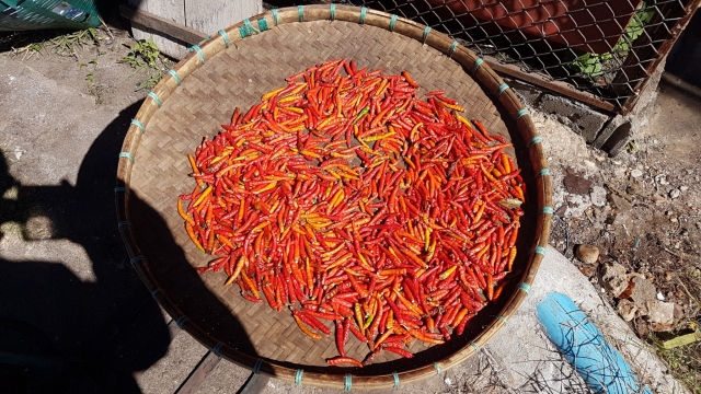 Na de koffie gaan we opzoek naar iets te eten. We betalen en lopen door de straat. Onderweg zien we pepers die gedroogd worden in de zon, kleine en grote. Een man stapt naar buiten en zegt met een enorme glimlach “Hello!”, ik groet hem terug. Volgens mij is hij trots dat hij een beetje Engels kent.