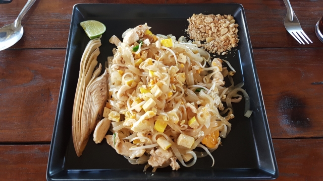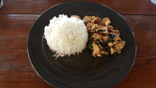We zien een leuke tentje en stappen naar binnen. Ze hebben een Engels menu, maar het Engels van de dame is alleen hetgeen ze nodig heeft. Rieneke bestelt pad Thai en ik neem gebakken kip met basilicum (ander soort dan in Nederland). We gaan zitten en al snel komt ons eten, net zoals de lokale bevolking. Toch is het een grote groep en loopt er een vrouwtje tussen. Misschien toch een tour groep?