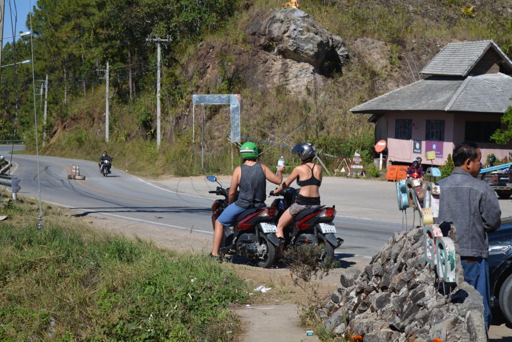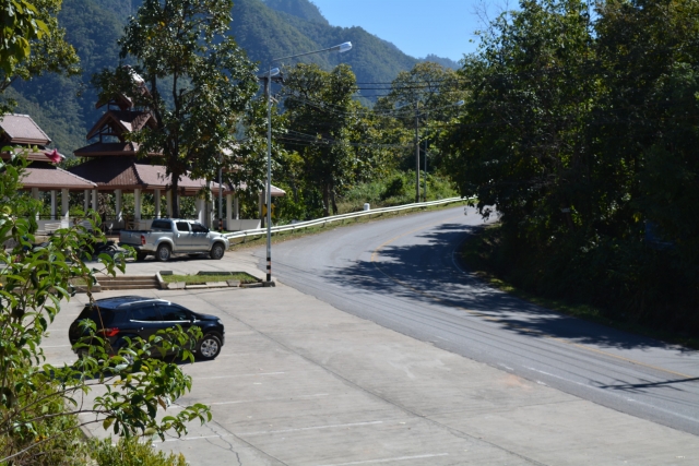 We komen bij een viewpoint en we stoppen even. Het uitzicht is weer prachtig. We zien hoge bergen bezaaid met bomen. Onder de bergen zien we een beekje lopen. We blijven even genieten en maken gebruik van het toilet. Ook staat er een Nederlands stel wat met de scooter de Mae Hong Son loop doet. Ze vertellen dat ze in eerste instantie de loop met de fiets wilden doen. Met de motor kom je al haast niet omhoog. Ze gaan ook direct door naar Pai, dus dat wordt flink doorrijden. Een scooter kan in dat gebied gemiddeld 60 km/u rijden. We hopen dat ze het halen voor het donker, want je wilt eigenlijk in het donker in de bergen rijden.