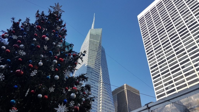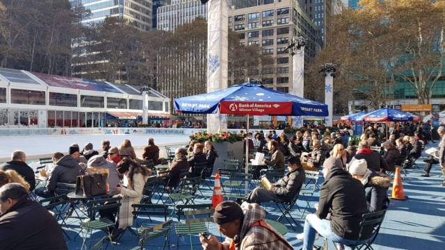 We lopen richting Times Square en we zien dat New York zich opmaakt voor de kerst. Overal zijn kleine kerststalletjes en complete pleinen zijn gevuld met kerstversieringen. Onderweg naar Times Square komen we zo’n plein tegen, net achter de Public Library, in Bryant Park. Het is een beetje new-art stijl allemaal, maar de sfeer is goed te voelen.