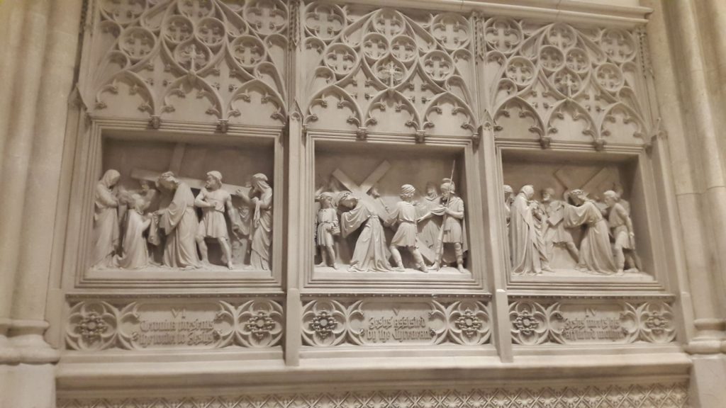 Als we binnenkomen moeten eerst onze tassen gecontroleerd worden. Daarna kijken we de enorme kathedraal in. Het gebouw is immens groot. Overal mooie versieringen, nissen overal, voor elke heilige een. Er zijn veel bezoekers, waarvan er toch veel mensen komen om te bidden. We zien ook veel zwervers zitten, die schuilen voor de kou.