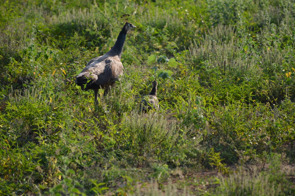 Als we weer doorrijden zien we de eerste van heel veel pauwen die we vandaag gaan zien. Mannetjes met hun mooie blauwe kleur en vrouwtjes die daarbij vergelijken maar saai bruin zijn. Sommige staan in al hun pracht en glorie op de weg of in het veld, hoewel de andere vogels daar wat jaloers op lijken te zijn. Hier en daar zien we nog een ukkie die met mama meerent.