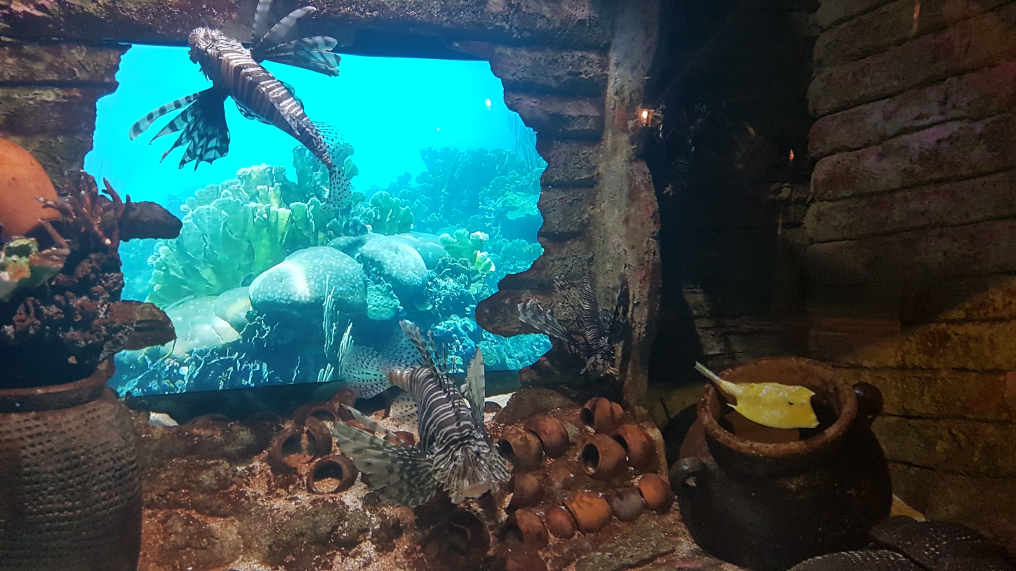 Als we de tunnel uitlopen zien we de plek waar de vissen straks gevoerd gaan worden. We zijn alleen veel te vroeg en dit is al het einde van het aquarium. En omdat de haaien toch niet groot genoeg zijn besluiten we niet te wachten tot de voertijd. We lopen verder en komen natuurlijk bij de souvenirshop uit. Maar als we doorlopen blijkt er toch nog iets meer te zijn. We zien onder andere hoe zeepaardjes groeien en er staan een altijd terraria met kikkers, schorpioenen en andere beestjes. Een leuke verrassing als je denkt dat je al klaar bent.