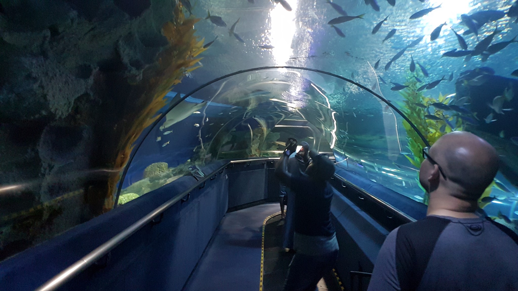 We lopen langs de verschillende aquaria en zien eerst allerlei kleinere vissen en dan de grote vissen die echt enorm zijn. Uiteindelijk komen we bij een punt waar we weer op de foto mogen, jeej, en dan worden we op een lopende band gezet. Oke, die zagen we niet aankomen. Maar het is wel supercool, we gaan door een tunnel heen met aan beide zijkanten en boven ons water en vissen. Door de lopende band kun je gewoon blijven staan en genieten van alles wat je ziet, zonder je druk te maken over struikelen of andere mensen. De band gaat echt super langzaam en ook dat is niet verkeerd. Dan roept iemand achter ons ineens “Shark” en zo zwemt er inderdaad een haai recht op ons af. Kenji vindt hem niet groot genoeg, maar ik ben wel onder de indruk. Wat een tanden heeft zo’n beest. Ook de pijlstaartroggen die rondzwemmen zijn enorm. Sommige hebben een superlange staart, en andere moeten het doen met een kort stukje. Ook zien we enorme schildpadden rondzwemmen. Constant schieten er stukjes van Finding Nemo en Finding Dory door ons hoofd.
