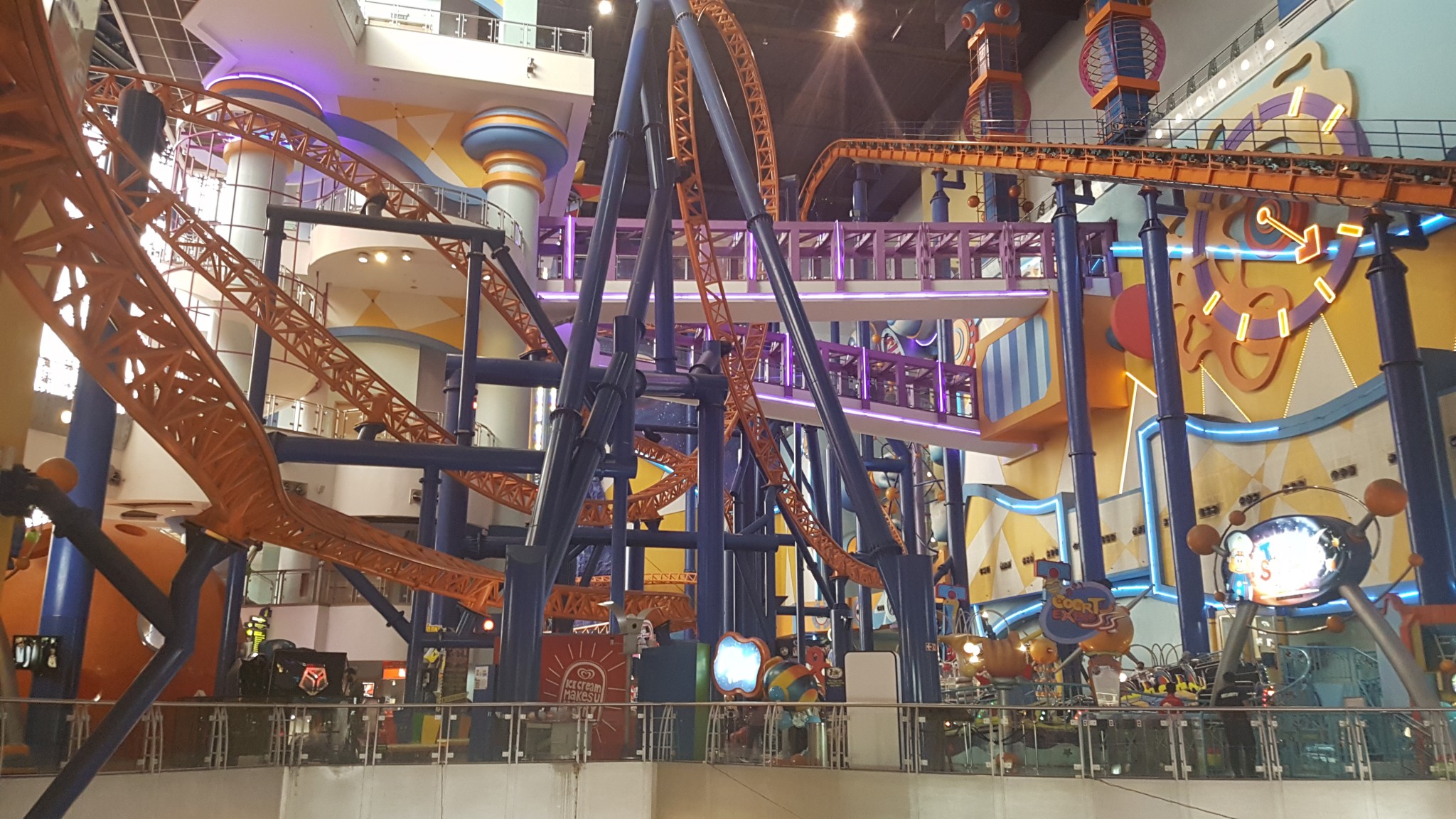 En dan de grootste klapper voor het laatst, een winkelcentrum wat zelfs een pretpark heeft, Berjaya Times Square. Dit winkelcentrum heeft maar liefst 10 verdiepingen en je kunt hier makkelijk verdwalen. Alle winkeltjes zitten door elkaar heen, voor de echte shoppingqueen waarschijnlijk paradijs, voor ons een beetje overkill. Wel zijn we heel benieuwd naar het pretpark, want er zou zelfs een achtbaan moeten zijn. Dus gaan we richting de 5e verdieping. Zodra we in de buurt komen zien we inderdaad de achtbaan lopen. We hadden gedacht dat de achtbaan meer in het winkelcentrum zou zijn, maar het bevindt zich in een afgesloten hoek. Het doet een beetje denken aan Speelstad Oranje, alleen zijn de attracties hier wat heftiger. Omdat het allemaal ronddraait en over de kop gaat is dat echt niks voor mij. We zoeken een plekje bij de McDonalds en kijken toe hoe andere mensen de longen uit hun lijf schreeuwen.