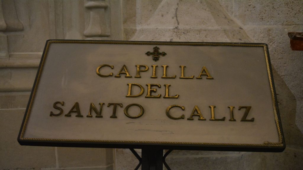 We lopen nog even het museum door en dan vraag ik aan Rieneke waar die heilige graal is. Ze kijkt me aan alsof ik ineens vloeiend Spaans spreek. Ik leg haar uit dat ik dat bij de fietstour gehoord heb. En we gaan weer Googlen. Het schijnt inderdaad in deze kathedraal te zijn. We kijken nog eens rond. Ik loop het museum uit en dan roept Rieneke mij. We moeten door het souvenirwinkeltje (natuurlijk) en dan staan we ineens in een vrij simpel kapelletje. En daar staat de beker. Rieneke fluistert dat ze deze ruimte al had gezien, maar geen idee had wat er zo bijzonder aan is.