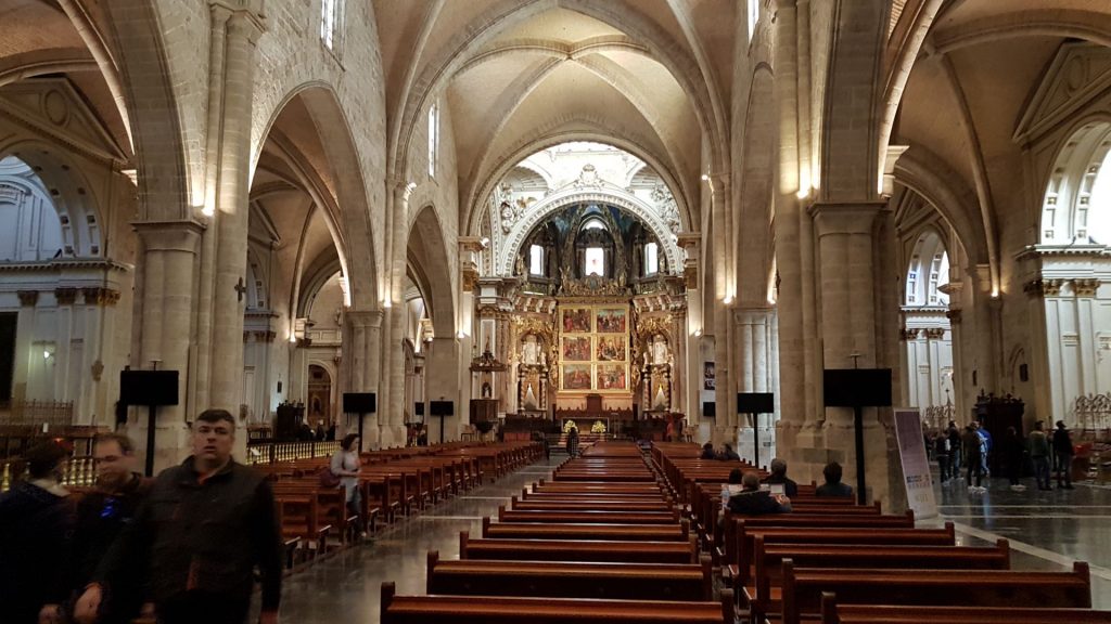 We lopen nu vlakbij de kathedraal van Valencia. We komen aan bij het plein, Plaza de la Reina, waar deze kathedraal zich bevindt en besluiten eerst wat te gaan eten. Na een simpele lunch lopen we naar het mooiste en grootste gebouw van dit plein. Je kunt het bijna niet missen. Tijdens onze fietstour heeft de gids het wel over deze kathedraal gehad. Hier zou de heilige graal zich bevinden. Alleen wordt het niet erkend als dé heilige graal en mogen alleen de Valencianen het zo noemen. Dit kleine detail is geheel aan Rieneke voorbij gegaan, maar dat later.