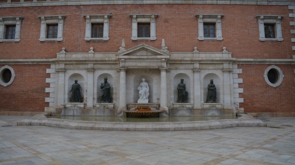 Na het bezichtigen van de kathedraal lopen we weer naar buiten. We lopen om de kathedraal heen naar de achterkant, waar het Plaza de la Virgen ligt. Een plein wat je bijna niet kan missen als je de oude stad van Valencia bezoekt. Het is een plein dat dateert uit de Romeinse tijd. In het midden staat een standbeeld, Fuente Del Agua de la Acequia, van een man die de rivier Turia moet voorstellen. De beelden om dit figuur heen beelden de zijrivieren uit.