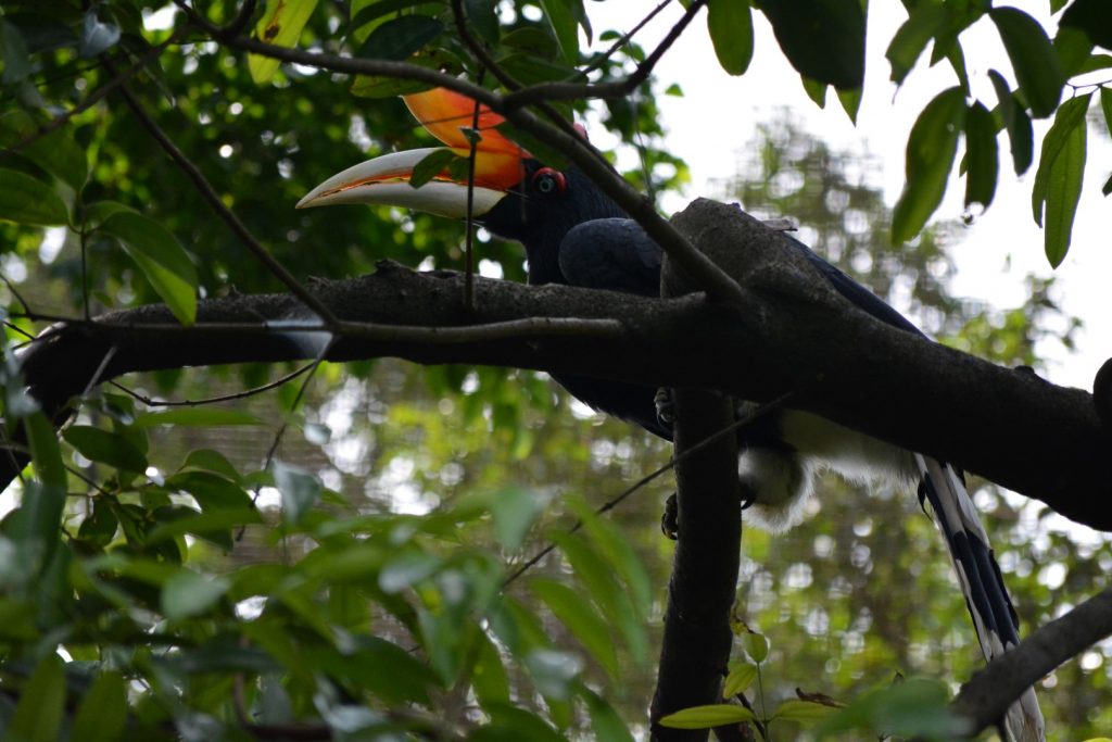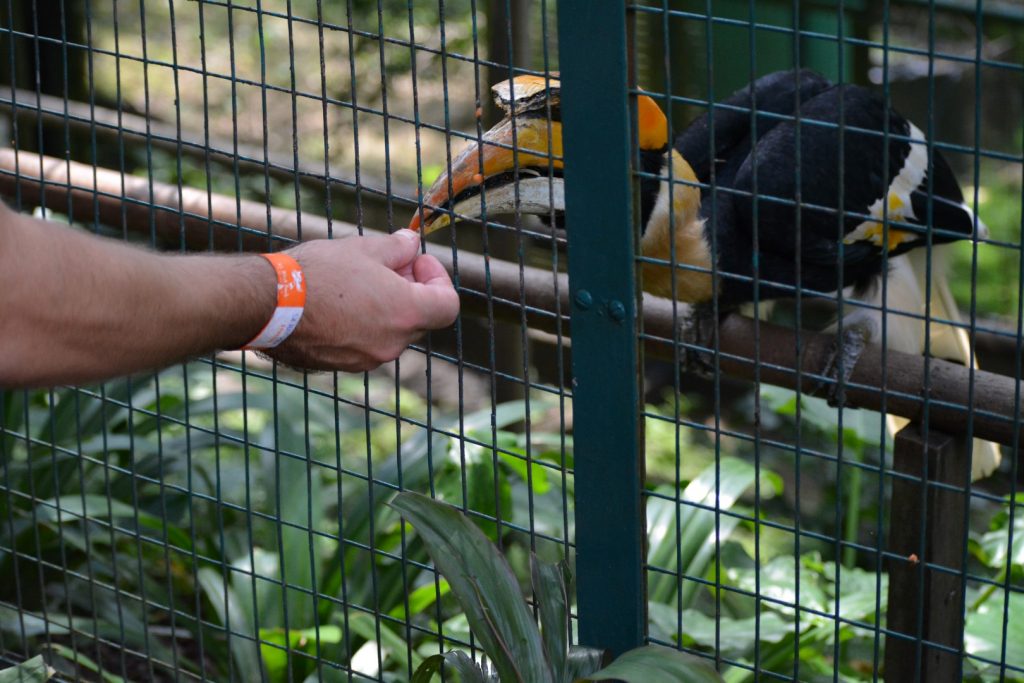 Even verderop mogen we zelf ook de vogels voeren, het is etenstijd voor de neushoornvogel. Voordat Kenji het in de gaten heeft krijgt hij iets in zijn handen geduwd om aan de vogel te voeren. Het zijn stukjes druif en dat vindt de neushoornvogel wel lekker. Toch is hij heel voorzichtig met het aanpakken van het voedsel. Daar kunnen die andere vogels nog wat van leren. De neushoornvogel die al wat groter is zit in de boom en krijgt een wat steviger maaltje. De verzorger gooit stukjes vlees die hij opvangt op het commando van het fluitje. Zodra hij genoeg heeft gehad zoekt hij het hoogste plekje in de boom om lekker uit te buiken.